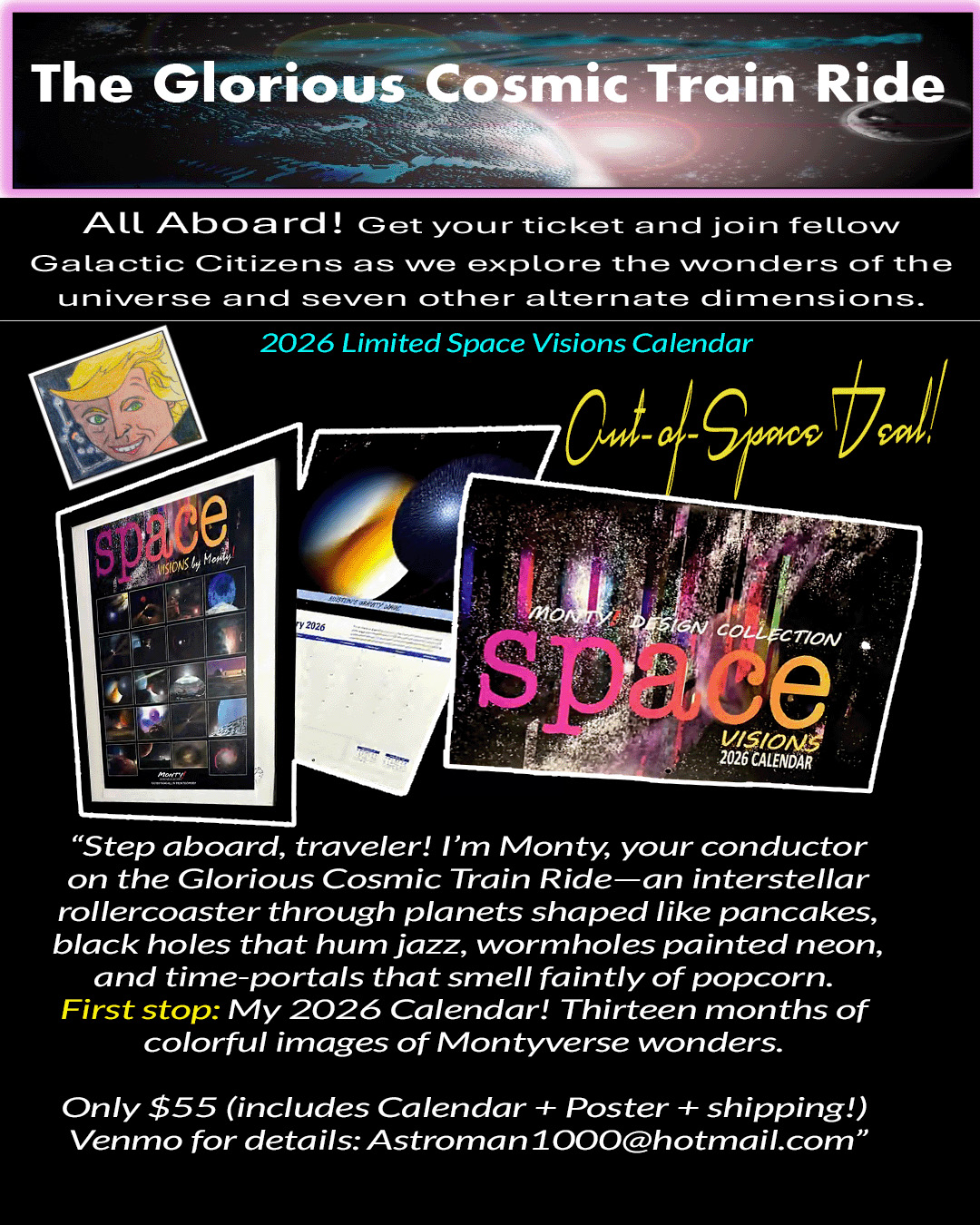 When the window opens, you’ll discover Monty’s 2026 Space Visions Calendar — a curated constellation of cosmic landscapes, celestial humor, and visionary art pulled straight from the MontyVerse’s ever‑expanding horizon.