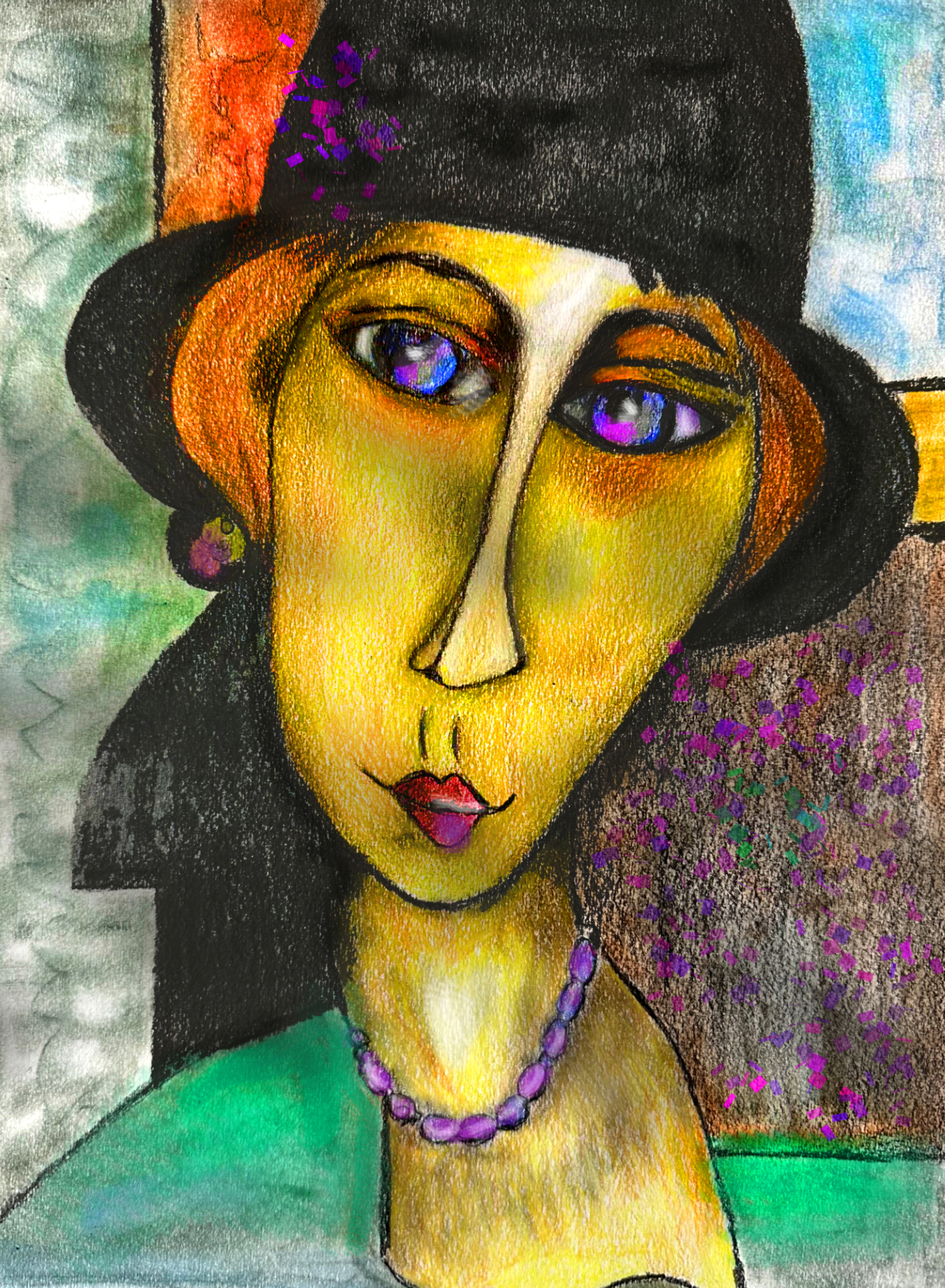 The portrait series spans multiple modes of expression — from tributes to master artists such as Modigliani, Picasso, Schiele, and da Vinci, to Monty’s own evolving bodies of work, including vinyl‑flooring art, workshop curricula, narrative character portraits, nudes, and large‑scale canvas explorations.